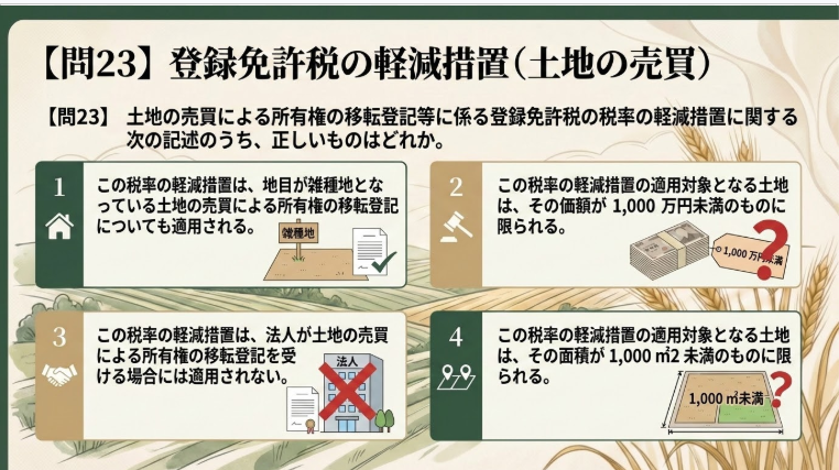R7年【問23】登録免許税の軽減措置(土地の売買)