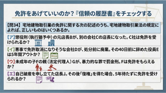 宅建試験でボケ防止 R7年【問34】この人に免許をあげていい?「信頼の履歴書」をチェックする物語