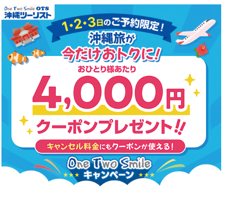【OneTwoSmileキャンペーン】毎月1・2・3日の予約でおトクに沖縄へ!お一人様4,000円クーポンプレゼント