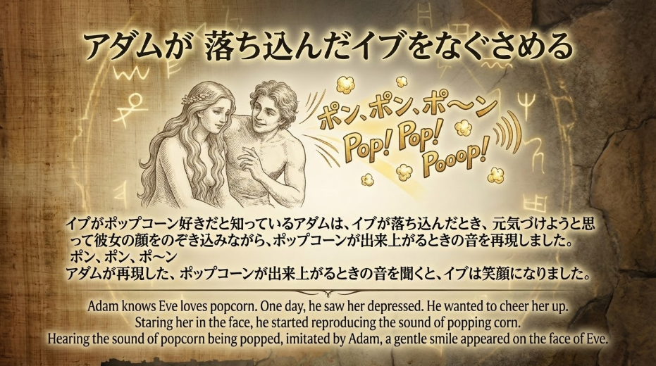 イブがポップコーン好きだと知っているアダムは、イブが落ち込んだとき、元気づけようと思って彼女の顔をのぞき込みながら、ポップコーンが出来上がるときの音を再現しました。