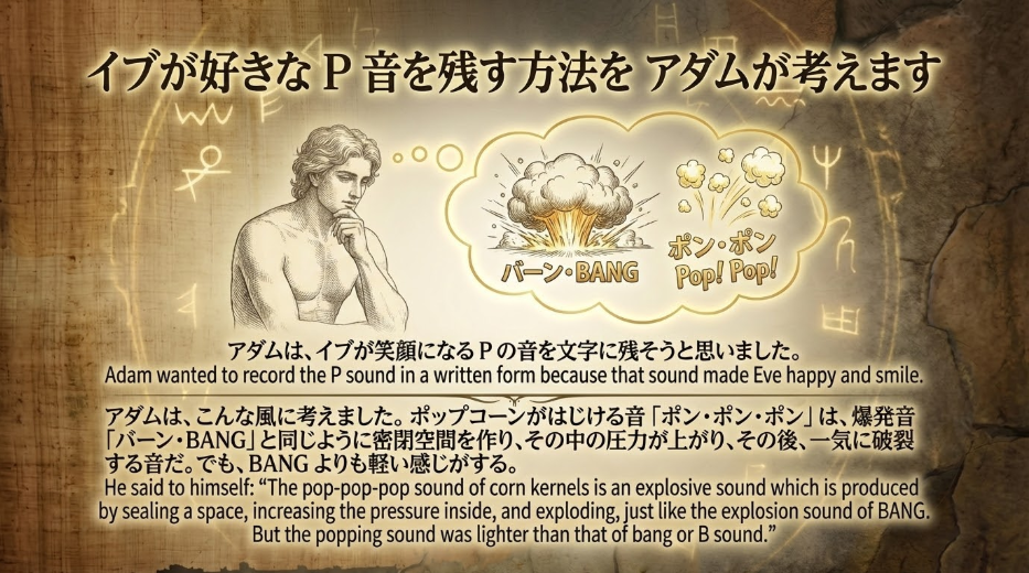アダムは、イブが笑顔になるPの音を文字に残そうと思いました。