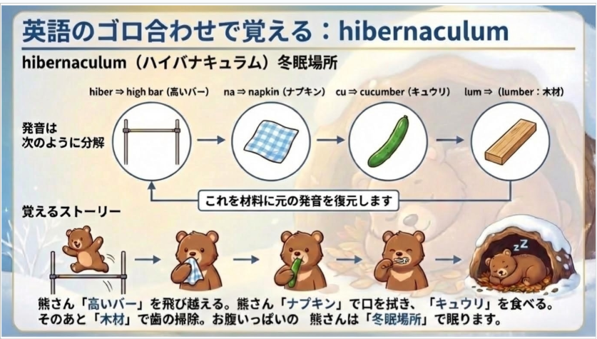 いかがでしたか? 今回は超難単語「hibernaculum(ハイバナキュラム)冬眠場所」 の覚え方を2つ紹介しました。