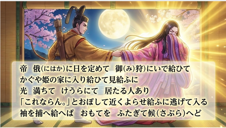 一方でかぐや姫は、「悩みもなく老いもしない」月の都よりも、「老い衰えていく」地球の親と共にいたいと願っています。不老不死よりも、限りある命の愛おしさを選ぶ、物語の核心部分です。