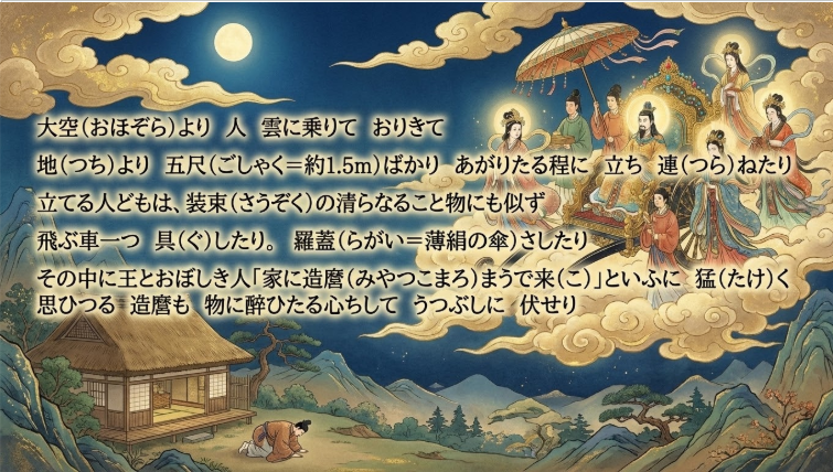 「空よりもおちぬべき心地す(空から落ちてしまいそうな気がします)」という表現が、かぐや姫の深い悲しみを表しています。天へ昇る身体とは裏腹に、心は地上(翁たちのもと)に引かれていることがわかります。