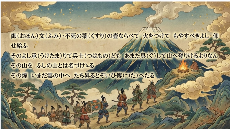 物語はここで終わりません。残された帝が、かぐや姫から託された「不死の薬」をどうするか。これが日本一の山、「富士山」の名前の由来となるエピローグへ続きます。