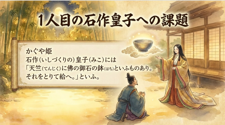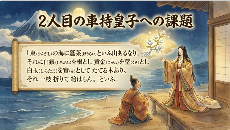 次は、いよいよ5人の貴公子たちに、それぞれ「何を持ってくるように」伝えたか、という具体的な難題の内容のシーンになります。進めてよろしいでしょうか?