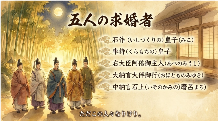 (その五人の名前は?) その名 一人は石作(いしづくりの)皇子(みこ)、一人は車持(くらもちの)皇子 一人は右大臣阿倍御主人(あべのみうし) 一人は大納言大伴御行(おほとものみゆき) 一人は中納言石上(いそのかみの)麿呂(まろ) たゞこの人々なりけり。