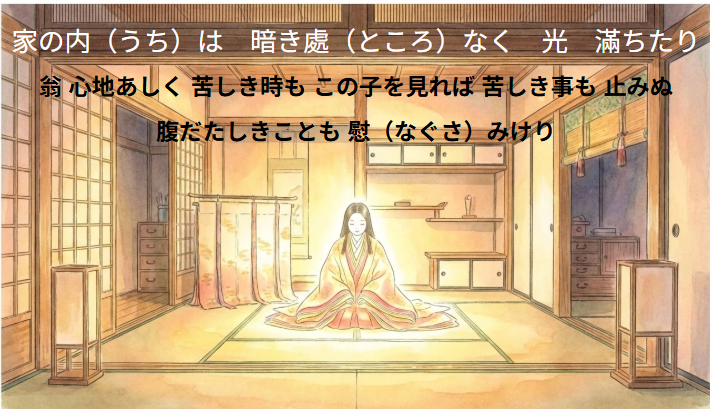 (翁が辛い時、子を見るとどうなる?) 翁 心地(こころち)あしく 苦しき時も この子を見れば 苦しき事も 止みぬ。 腹だたしきことも 慰(なぐさ)みけり。
