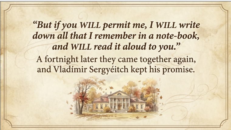 次は、ウラジーミルが「いっそ物語を書き留めて読んで聞かせよう」と提案し、実際に物語が始まる場面へと続きます。その部分の整理も進めましょうか?