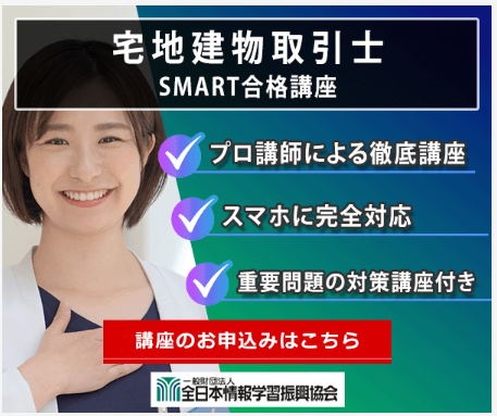 - 宅建試験の即戦力なら: [SMART合格講座] スマホ完結の学習システムと厳選された32時間のカリキュラムで、スキマ時間を活用して宅建合格を目指す特化型講座です。